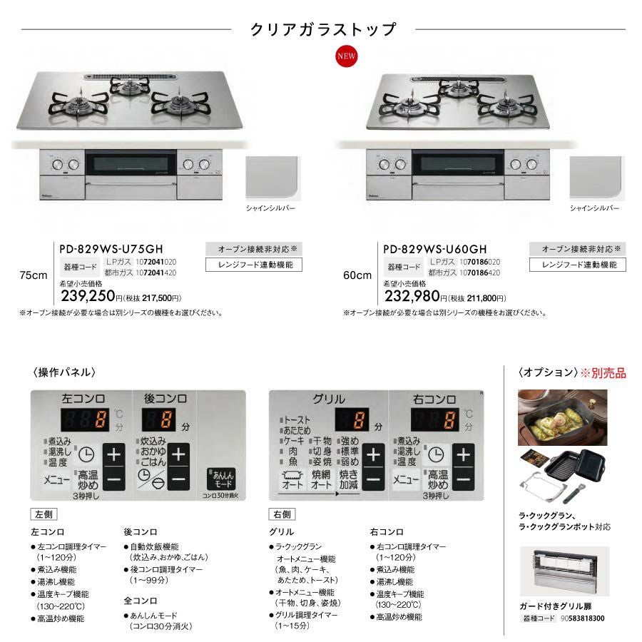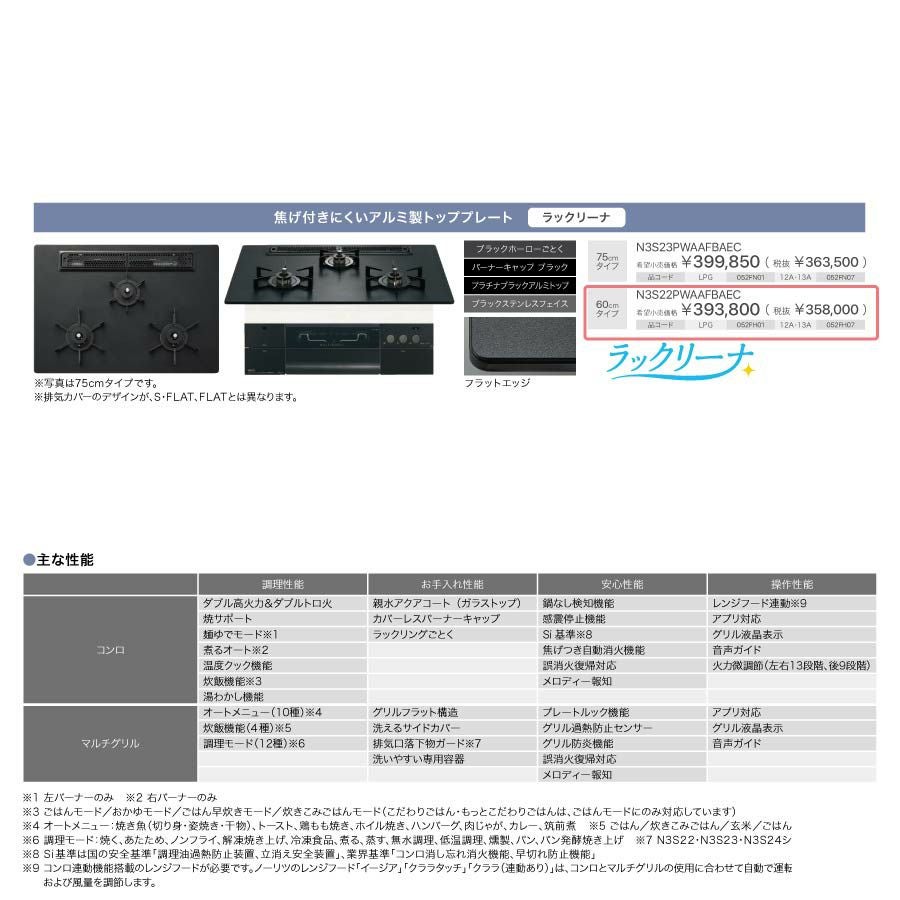 豊富な調理機能で、食卓を華やかに ノーリツ ビルトインコンロ N3S22PWAAFBAEC PROGRE プログレ プラチナブラック 60cm幅 ラックリーナ
