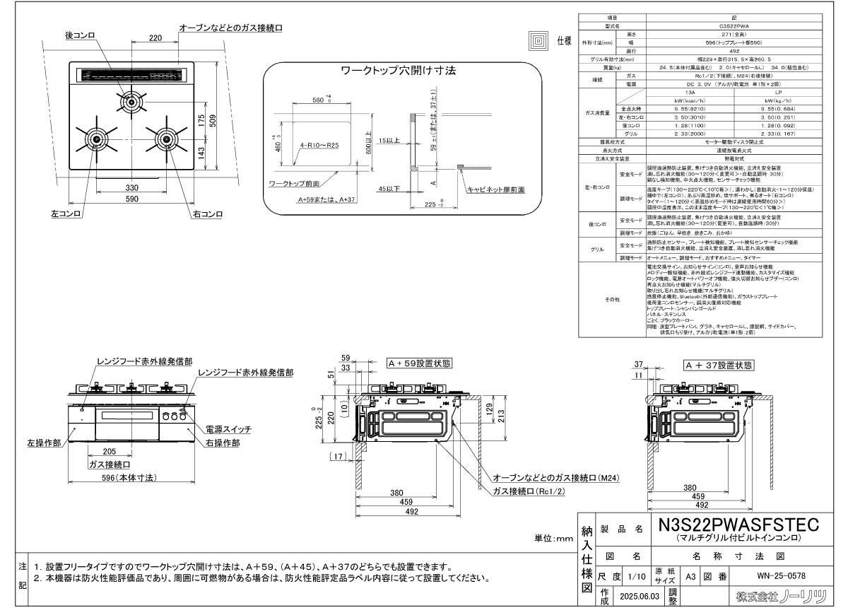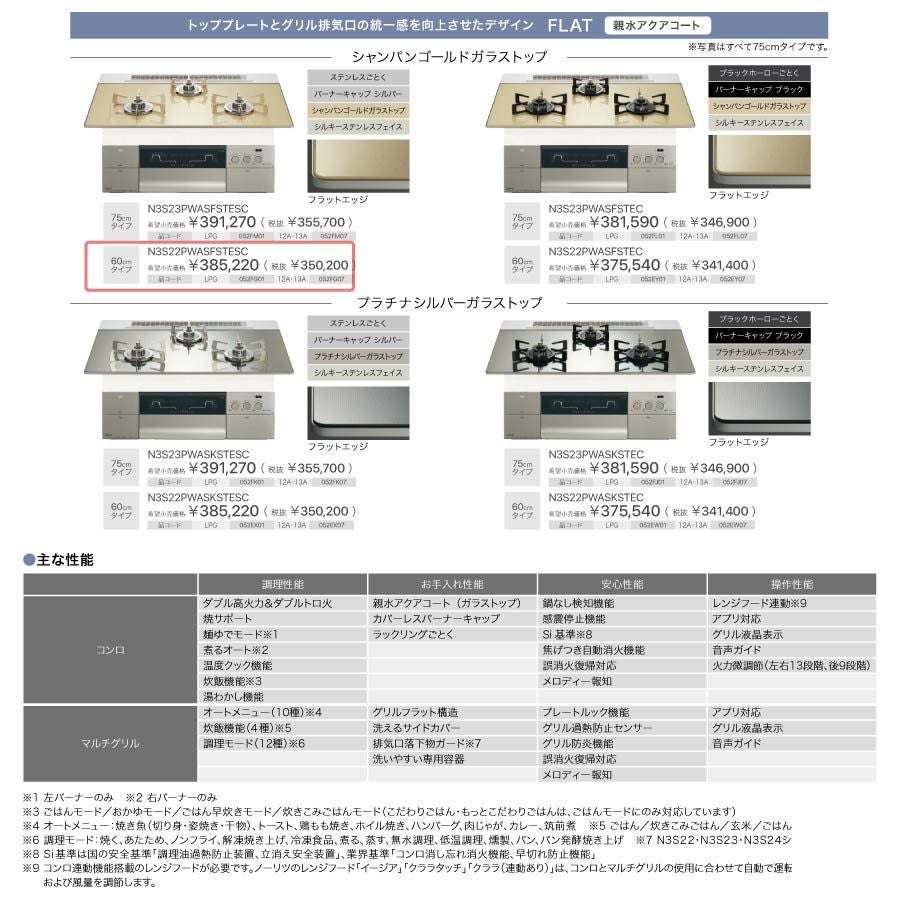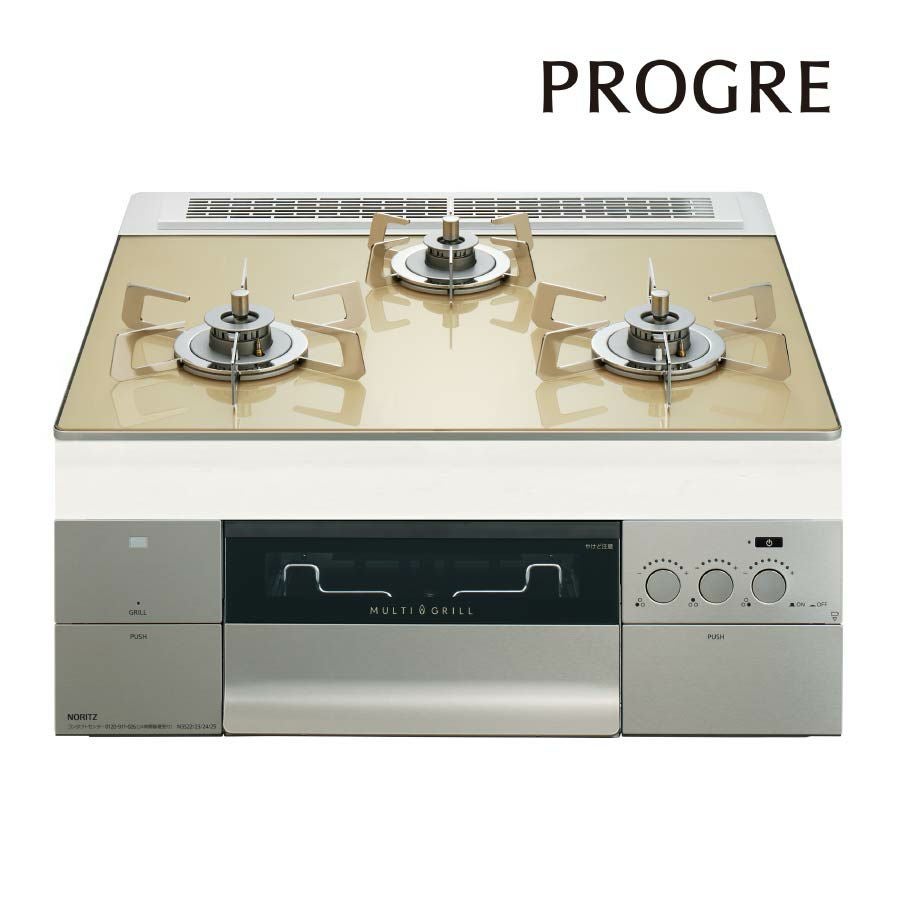 豊富な調理機能で、食卓を華やかに ノーリツ ビルトインコンロ N3S22PWASFSTEC PROGRE プログレ シャンパンゴールド 60cm幅 FLAT