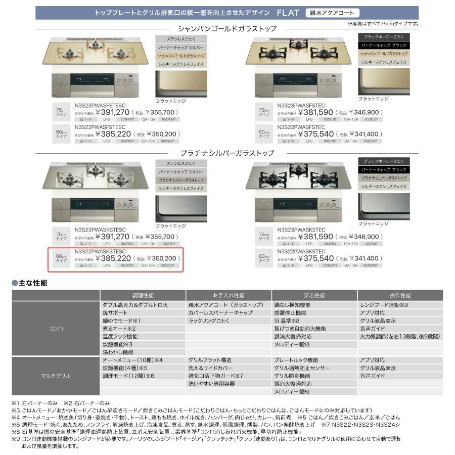 豊富な調理機能で、食卓を華やかに ノーリツ ビルトインコンロ N3S22PWASKSTESC PROGRE プログレ プラチナシルバー 60cm幅 FLAT