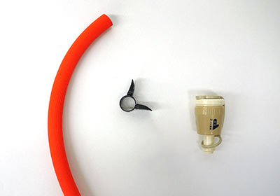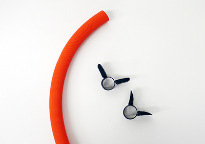 赤い線までしっかりとホースを差し込み、バンドで固定します。 |