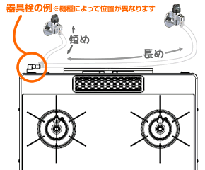 ゴムホースの差込口(器具栓)の位置は機種によって違います。ガス栓の位置と、器具栓の位置をよく確認して、ネジレや折れなど無いように長さを調節してください。